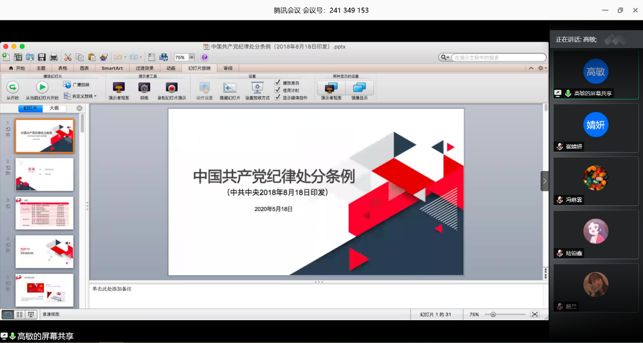 5月19日中午,巴卡漫画 开展了第十三期发展对象培训班第5次线上党课。院党委副书记高敏为巴卡漫画 发展对象讲述了“中国共产党纪律处分条例及廉洁自律准则”的专题党课。高敏从大学日常生活中的点滴事件入手,通过在学习评优、班级工作等方面设定各种情况,引导同学们展开关于廉洁诚信的讨论和思考,鼓励同学们针对不同的情况积极发言,阐明自己的观点和想法。她首先从中国古代文化的角度解释了廉洁的含义:不受曰廉,不污为洁。接...
