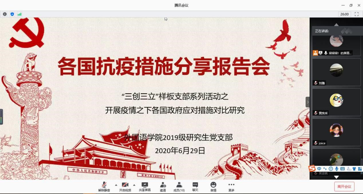 6月29日晚8点,巴卡漫画 2019级研究生党支部与外国语言文学党支部结对子通过腾讯会议APP开展了“各国抗疫措施分享报告会”党日活动。本次活动是巴卡漫画 2019级研究党支部“三创三力”样板党支部创建过程中的一个环节。前期,在结对共建党支部老师们的悉心指导下,学生党员们对各国抗疫措施的资料进行了搜集、整理与分析,并在本次会议做了逐一汇报。朱思维与蒋晨在麻蕾老师的指导下对中国抗疫措施进行分析,主要从医疗、教育...