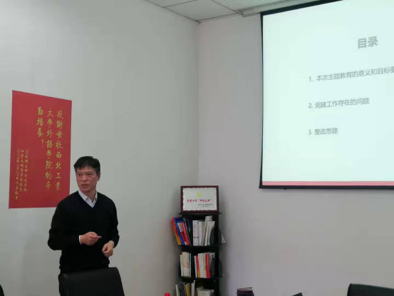 张应祥同志以《守发展初心、找工作差距、促认识提高、抓工作落实》为主题,首先介绍了本次“不忘初心、牢记使命”主题教育的意义和目标要求。接下来,系统分析了学院党建工作存在的问题,从党建工作、思想政治工作、意识形态工作、党风廉政工作、统战、群团工作、安全稳定工作、文化建设等七个方面系统讲解了党委工作的主要内容,对支部标准化建设中涉及的规范与要求进行了介绍,并针对工作中存在的问题进行了逐一查摆。最后,提出了对问题的整改思路。