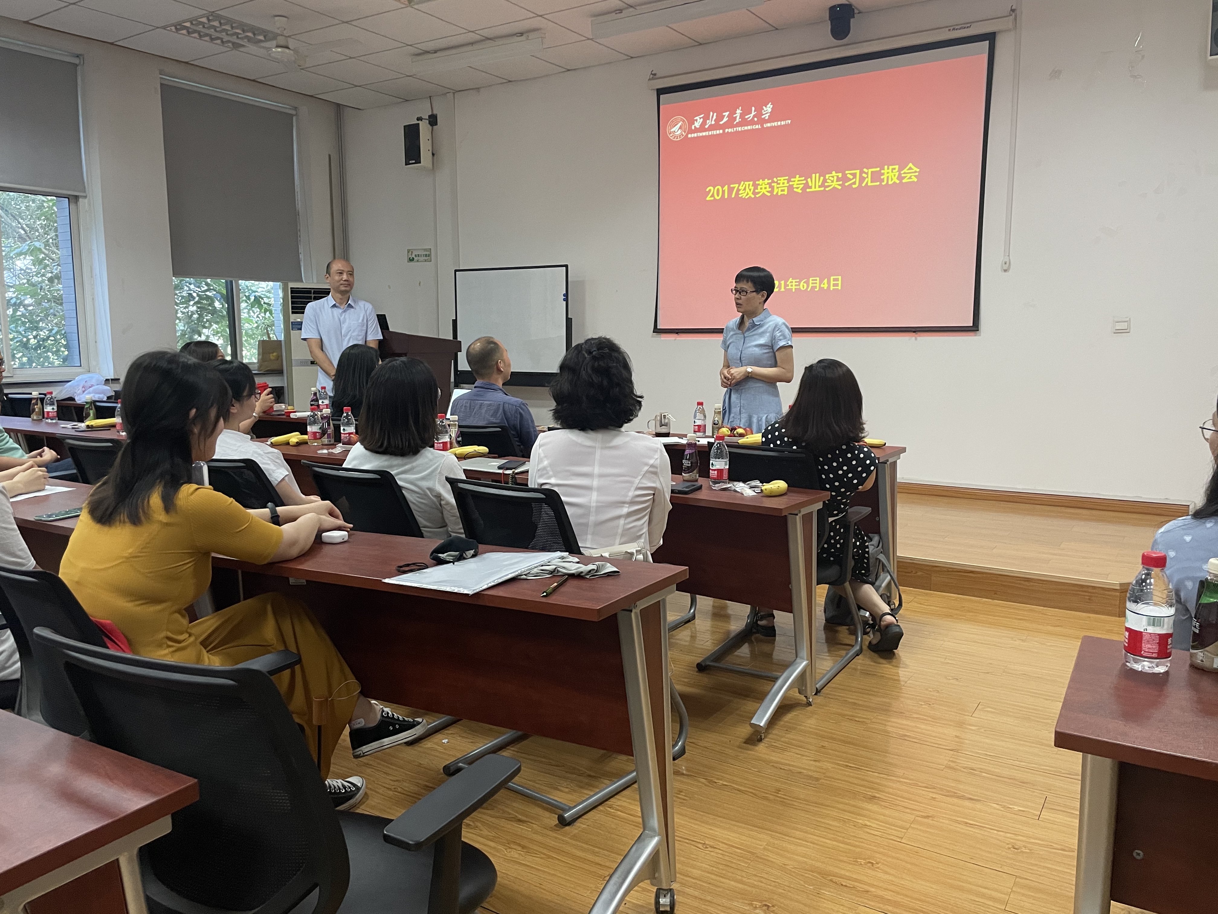 2017级英语专业本科毕业生实习汇报会在学院204教室举行。英语国家级一流专业建设点负责人张奕教授、外国语言文学系主任李利敏副教授、英语专业负责人刘菲副教授及全体专业教师、班主任、本科教学秘书、辅导员参加了本次会议。汇报会由班主任康坛老师主持。