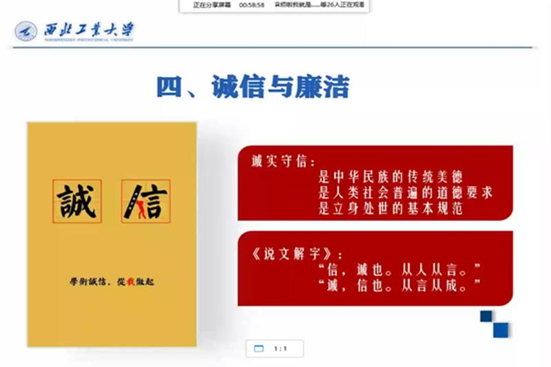 接着,侯亚涛再次带领同学们重温了校风校训,通过讲述西工大首届党委书记刘海滨廉洁朴素的作风,首任校长寿松涛带领华航举家西迁的壮举,以及中国人民解放军空军少将唐铎的开创精神,希望同学们能够坚守、传承先辈们的精神和道德品质,深刻体会“公诚勇毅”、“三实一新”的时代内涵。最后,他期望同学们在今后的学术、工作、生活等方方面面都能做到廉洁自律、表里如一、努力进取,老老实实做人,干干净净做事,做到“真的就是真的,不把虚假的伪装成真的”,真正将做学问和做人统一起来。