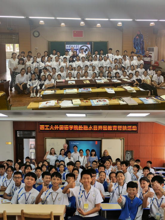 7位中外老师先后抵达融水县民族中学及融水县高级中学,参与课堂教学活动。3位外籍教师的到访,打破了校园以往的宁静。同学们纷纷上前把3位外教团团围住,用惊奇的目光打量着来自远方的客人。胆大的同学甚至用简单的英语跟陌生的客人打招呼、送问候。外教们也用西方特有的方式,热情地回应着学生。课堂伊始,张应祥首先介绍了此次帮扶活动的目的和意义;随后,在两名大英教师的协助下,Christine Tanner 教授与McEwan 夫妇进行了合作教学,分别为百余名初中和高中学生及任课教师展示了长达一个半小时的示范课。在课堂上,Christine Tanner 教授,McEwan 夫妇从教唱英文歌曲入手,激发同学们对英语学习的兴趣,再深入浅出地介绍了西方文化,如西方的重要节日、学生领导力的培养、美国大学的申请流程等,并开展了丰富多样的室外活动。外教们精湛的教学经验、纯正的发音、风趣幽默的肢体语言赢得了在座师生们的阵阵掌声,更是深深地吸引了每一个学生。此外,三位外籍教师还与融水县50余位参加国培班的中学优秀英语教师就教学方法、如何提高学生学习兴趣及如何针对学生学习特点开展个性化教学等方面进行了深入的交流探讨。此次教育帮扶活动虽时间短暂,但所获当地师生的积极反响空前热烈,对当地英语老师教学方法革新及课堂教学改革起到了积极的促进作用,学生们的英语学习兴趣得到了极大的激发与鼓励,外教与学生之间也建立了深厚的友情。Christine Tanner 教授激动地说,明年还会带上自己的家人再来融水,看望可爱的孩子们。