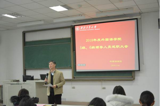 院长尹晓煌首先对学院工作进行了总结,他回顾了这一年来,在全体教职工的努力下,学院在各方面取得的成绩。在过去的一年,学院加强对外宣传,扩大对外影响力;加大人才引进力度,提高学院博士率,举办高水平学术讲座、加强国际交流等。2018年,学院在博士点建设方面取得可喜成绩,在学科建设方面取得较大突破。未来的一年学院将努力加快二级学科博士点的建设,全面提高办学水平,不忘初心,砥砺前行,为建设特色鲜明的一流学院而努力奋斗。