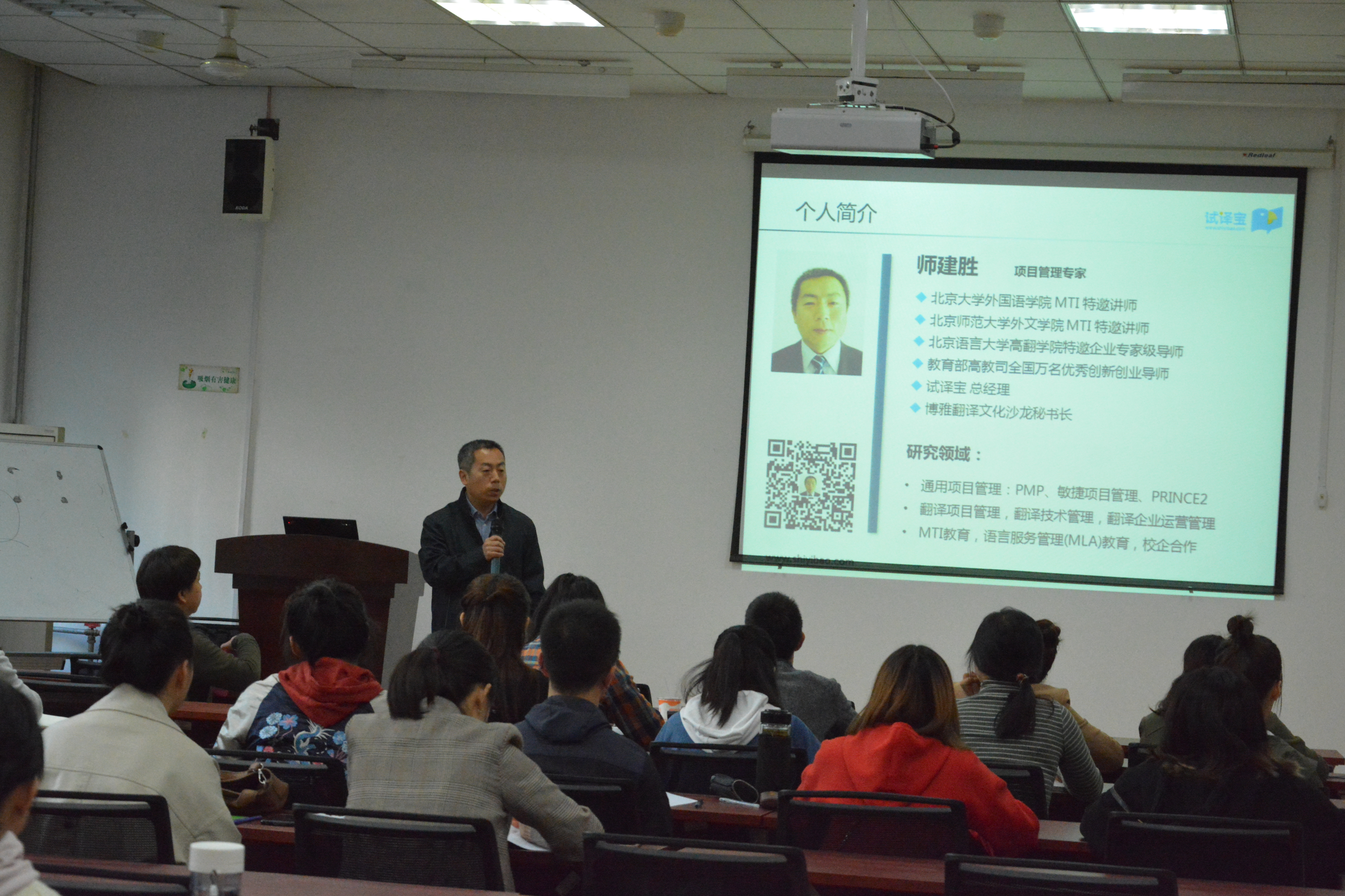 首先,阮红梅介绍了师建胜在推进翻译事业发展方面的成就,并对师经理的到来表示热烈欢迎。随后,师建胜从语言服务企业对翻译专业学生的期待、翻译专业学生在翻译技能之外的项目意识培养、人工智能技术对翻译教育的冲击和再思考、新技术背景下的翻译职业选择等四个方面展开详细的阐述。他指出当今社会对MTI等翻译人才的要求:高层次、应用型、专业化,人机结合成为新常态。