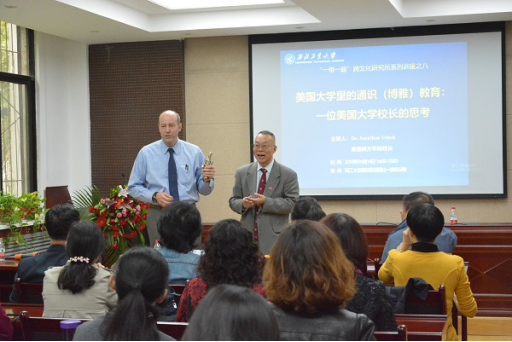 尹晓煌院长首先代表学院对Dr. Jonathan Veitch的到来表示欢迎,并且对Dr. Jonathan Veitch作了简单介绍。Dr. Jonathan Veitch博士毕业于哈佛大学,现为美国西方学院(Occidental College,奥巴马总统母校)校长,他曾任威斯康辛大学新闻系教授、纽约New School University副校长,文学院院长等职。Dr. Jonathan Veitch的研究领域涉及美国文学、历史和电影艺术和高等教育,其代表作《American Superrealism: Nathanael West and the Politics of Representation in the 1930s》曾获“美国图书奖”。