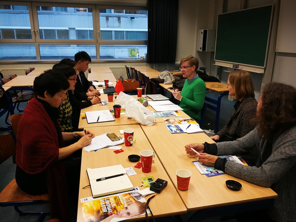 张奕副院长一行受到VUB大学文学院副院长、语言学和文学硕士项目负责人Ann Peeters,国际合作处处长Jacqueline Couder等的热情接待。虽然正赶上布鲁塞尔五年不遇的低温和雨雪天气,双方的热情却丝毫没有因此而减少。双方先是互相看了学校宣传片,为了增进了解,张奕副院长还对巴卡漫画