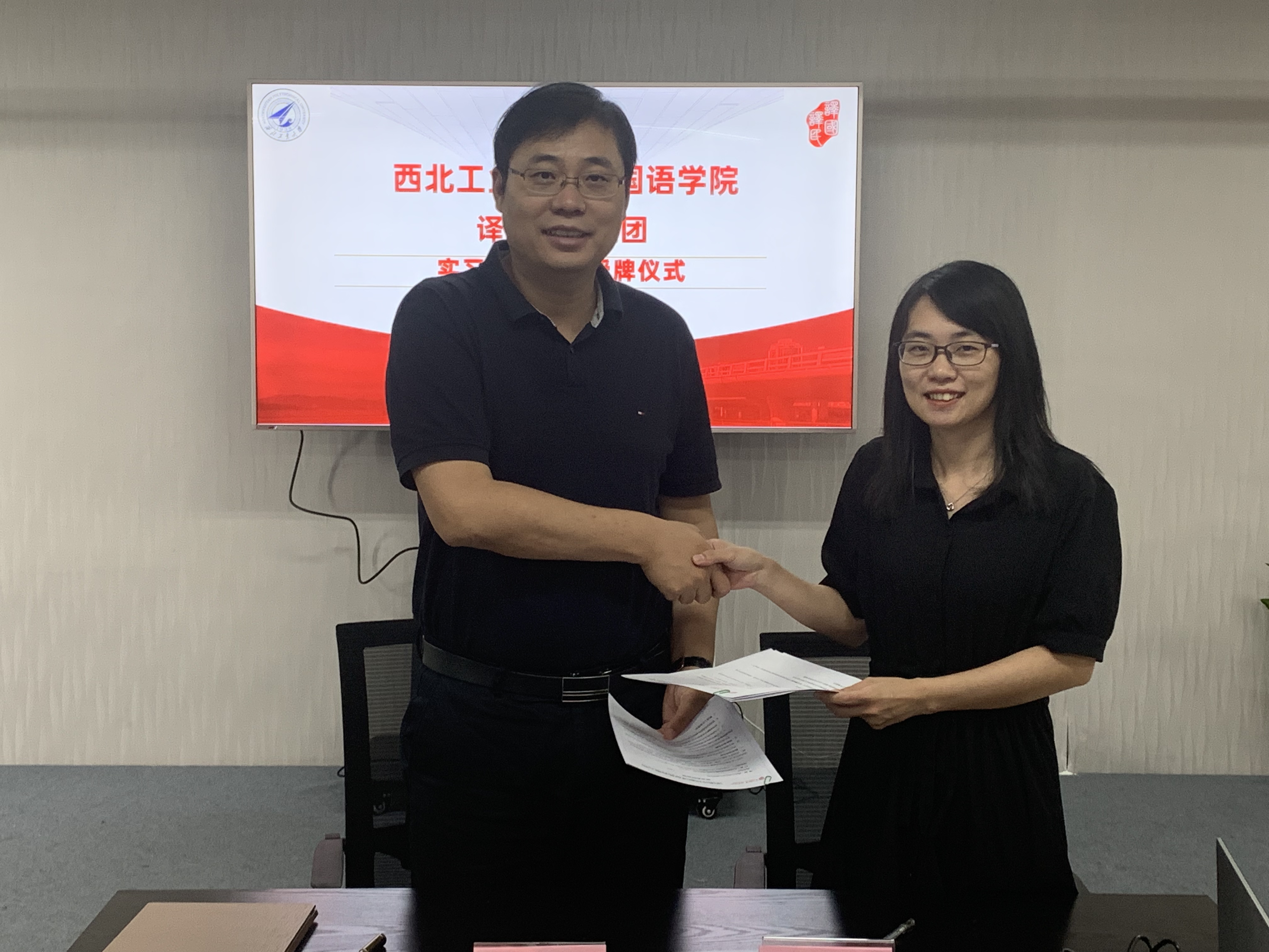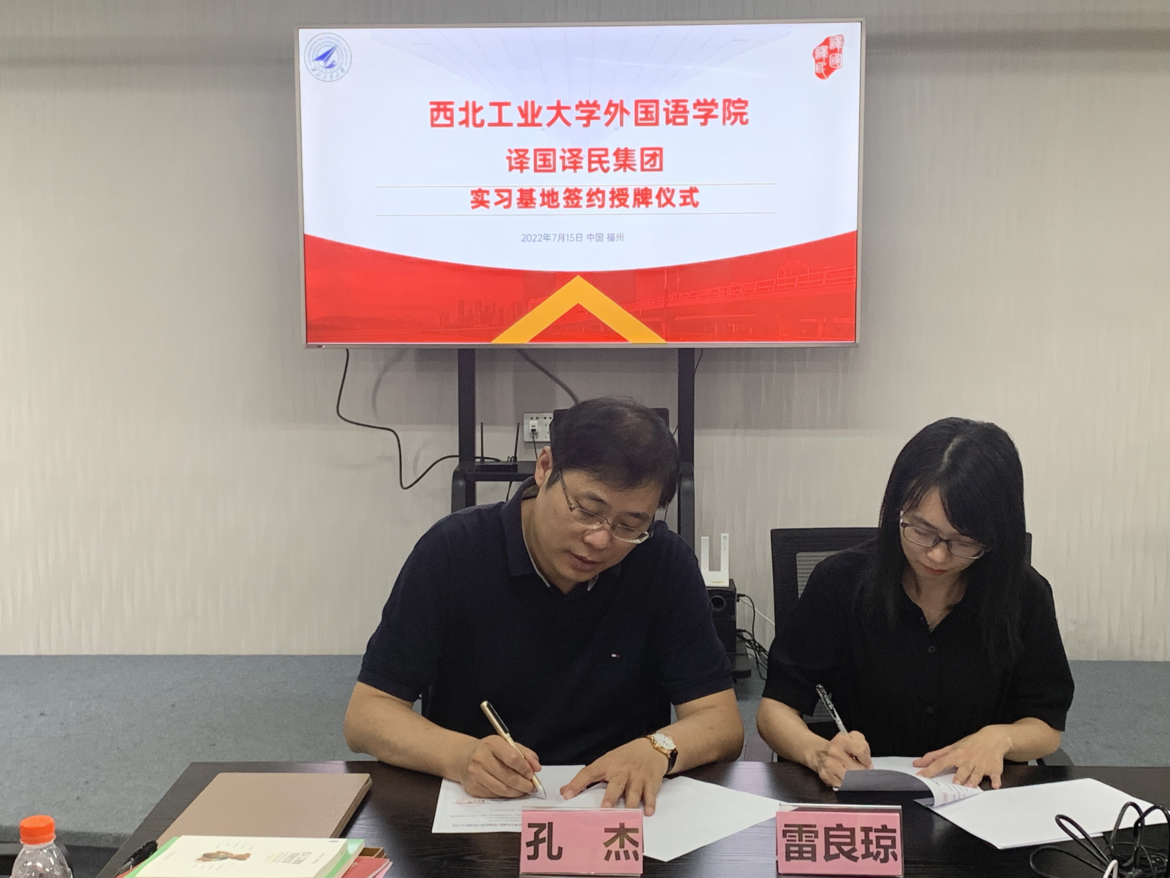 一行的到来表示热烈欢迎。孔杰对译国译民翻译服务有限公司的热情接待表示诚挚感谢,对公司的国内知名度、发展速度、校企合作等表达了赞许,同时介绍了学校的基本情况以及学院教学科研、师资力量、学科平台和人才培养等方面情况,表达了深化合作的意愿。张奕介绍了学院校企合作的现状以及深入推进产学研合作的基础。随后,郑莺介绍了公司近年校企合作的具体内容和取得的成果。随后,双方就校企合作、访企拓岗等事宜进行了商议,最终签订校企合作协议并授牌。