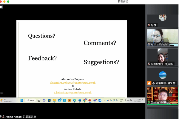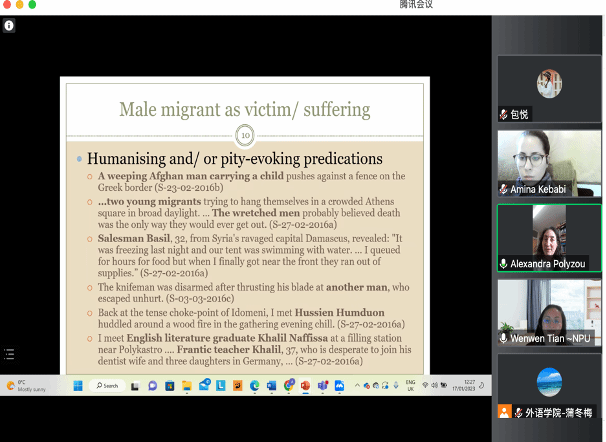 讲座伊始,张奕教授对Alexandra Polyzou博士和Amina Kebabi博士为学院师生进行线上讲座表示欢迎,并对两位博士作了简要介绍。随后,两位博士就英国报刊中的性别话语和移民话语研究进行深入分析。报告主要从研究意义、研究方法以及研究结果展开。性别歧视、身份形象、移民问题一直是主流媒体关注的焦点,对于移民的“刻板印象”也一直深入人心。研究选取英国具有代表性的四个时间段的报刊内容作为研究语料,发现男性移民常常被认为很有野心、充满威胁;而女性则被认为是男性的追随者甚至被刻画成无助的受害者。两位学者通过直观的例子深入浅出解释观点。