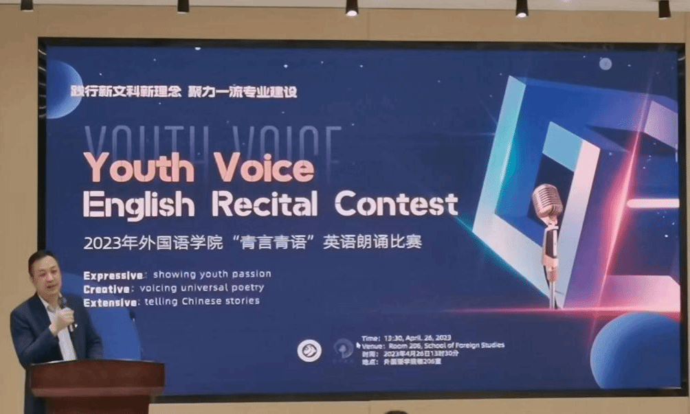 英语专业扩展到全校各个学院和专业的美好愿景,希望能够解决文科专业“卡嗓子”的难题,在全球唱响中国故事。孔杰表示此次活动意义重大,是践行新文科新理念、聚力一流专业建设的有力实践。在他看来,此次朗诵比赛选用的文本多为经典文学篇章,因此这既是一个比赛的过程,也是一个学习的过程。在讲话末尾,孔杰预祝所有参赛同学都能够有所收获,取得满意的成绩。