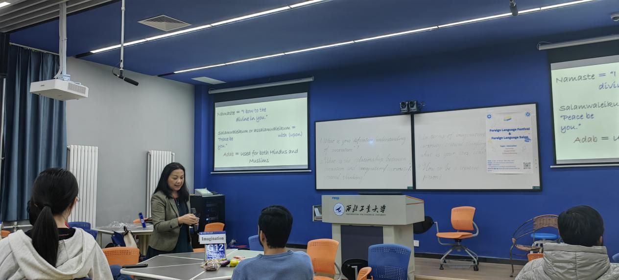最后,期盼已久的本次外语沙龙“重磅”——来自长安大学的外教Puii老师隆重出场!Puii老师从询问大家对于印度的印象过渡到她对印度文化的讲解,图文并茂地向同学们介绍了印度的历史,礼仪、美食。她用丰富的肢体语言和幽默的话语为大家带来一道印度文化盛宴!