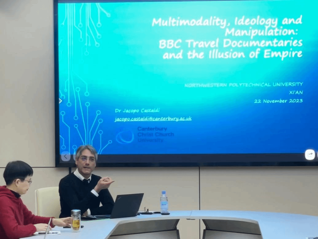 Jacopo Castaldi博士目前就职于坎特伯雷大学语言中心,其研究兴趣主要包括批判性话语分析、多模态、大众传媒以及符号学。Jacopo以“Multimodality, Ideology and Manipulation: BBC Travel Documentaries and the Illusion of Empire”为主题,以多模态的形式展示了其对BBC纪录片的创新解读,为语言学与现代信息技术的深度融合提供了独到见解。