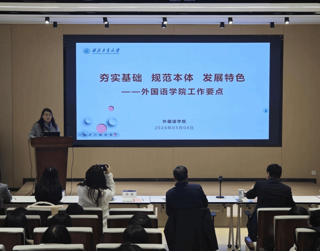 孙瑜首先介绍了新一届领导班子具体分工,随后介绍了新学期学院工作思路要点并部署重点工作。她强调,学院围绕学校“强特色、筑高峰”的总体发展思路,聚焦学校“总师型人才”培养的具体要求,对照学院学科建设、人才引育、科学研究、队伍建设等发展现状,梳理学院发展路径,明确学科发展本体方向,细化工作方案。她要求与会人员要根据学校发展的不同阶段去分析问题,夯实自身教学科研基础,明晰自己的“特色”,实现自己的“高峰”,与学院高质量完成2024-2027年目标责任制任务“同频共振”。