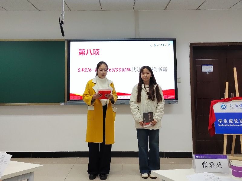 此外,为推动本研班级在学业指导、活动开展各方面进行互助合作,研究生24216-1班与本科16012201班进行共建,并在现场互赠书籍以示友好合作。两位班长也分别发表了各自的共建感言,他们表示未来会增强同学之间学习经验、职业发展等方面的交流合作,推动彼此共同成长。